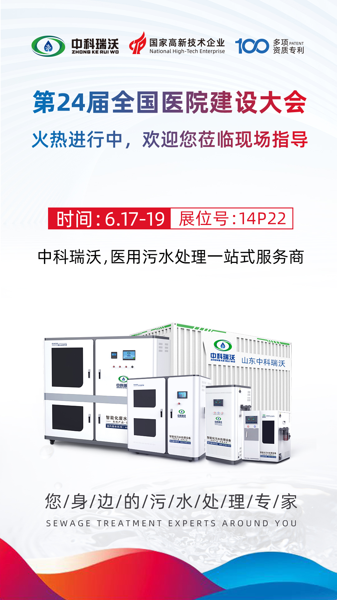 此次展會為期三天,6月17-6月19號您都可以蒞臨全國醫(yī)院建設(shè)大會中科瑞沃展位,我們將為您提供專業(yè)系統(tǒng)化的醫(yī)用污水解決方案!